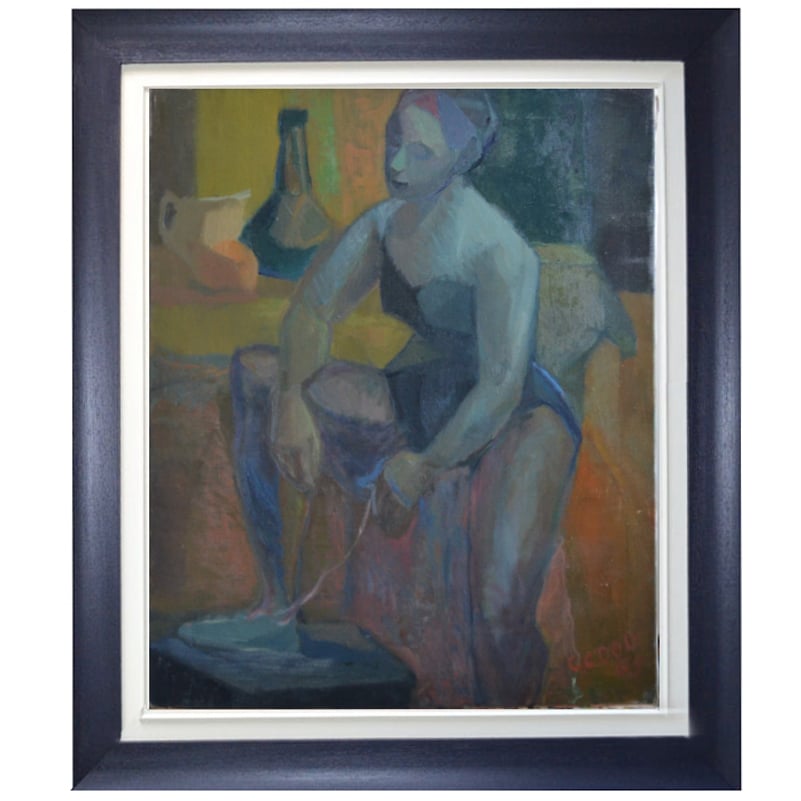 A red head-scarfed ballerina ties her pink ribboned ballet shoe, her head tilted in concentration. Wonderful peacock and inky blues contrast with an old rose yellow background. To be noted the super angular rendering of her bodice and waist.