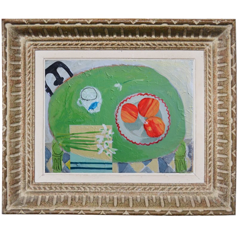 In this vibrant still life Ellis depicts a spring-green table, a red, scalloped edged plate of peaches, a nautical napkin of snowdrops and small mug with a blue bird. In the background a lilac-grey chequered rug and the silhouette of a distorted chair. Richly painted with thick, juicy brush strokes.