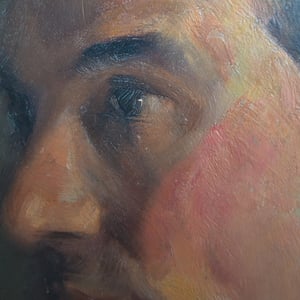 Beautiful French portrait painting, an apricot light uplifts the right hand side of the artist's face, aubergine and chocolate shadow the left. Deliciously rendered, the artist's face caught in the moment.