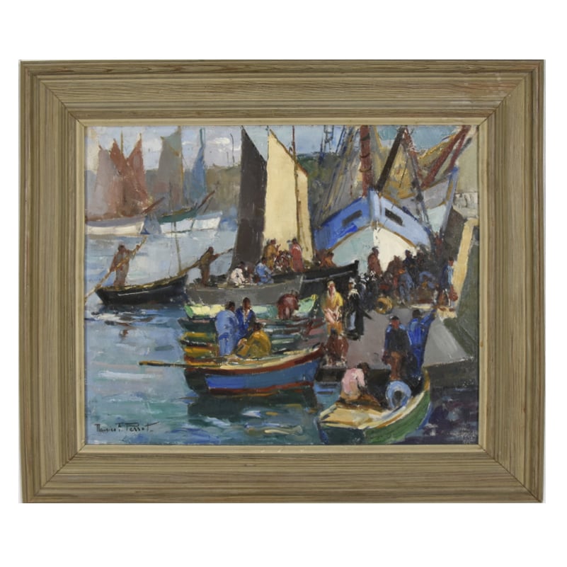 Early 20thC 'Breton Quayside' oil painting Maurice F Perrot (1892 -1974)