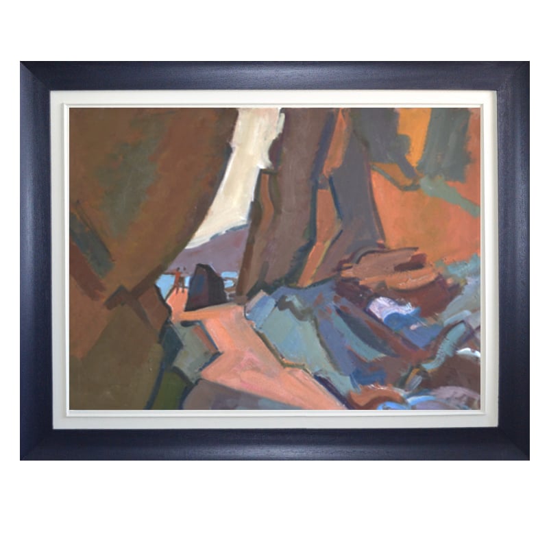 This good sized, monumental painting depicts two curtains of rock, transecting the canvas. A Philadelphia Cream Cheese wedge of light illuminates two chums on the rocks. A sweet, salmon pink flash takes the eye from the front of the painting to the figures. Seaglass and urchin coloured forms are laid down in solid segments.