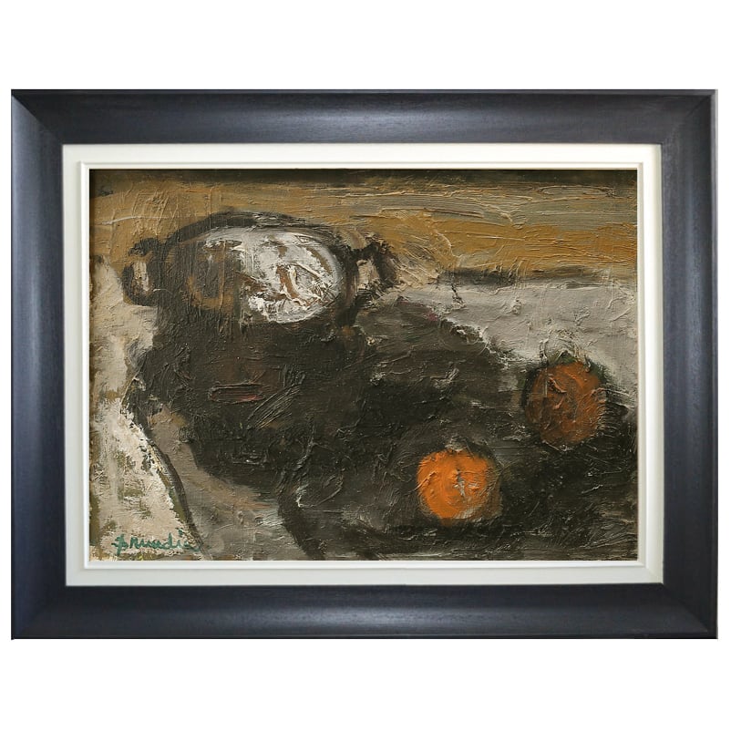Richly painted with great swathes of texture this mid-century painting ticks all our boxes. A sturdy black pot, with a chalk white centre, casts a charcoal shadow across two oranges, one radiant as if caught in a spot light.