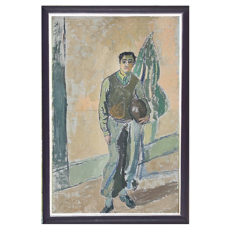 A dapper gentleman, in a sage waistcoat and moss green plus fours, nestles a ceramic vessel under one arm. His beautiful, cubist face has coral lips and quizzical eyebrows. Loosely painted with vibrant strokes, very much of the period.
