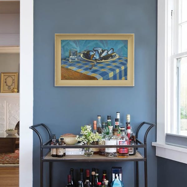 1957, French Oil on Board; Moules on a Checked Table Cloth Jacques Andre Duffour (1926-2016)